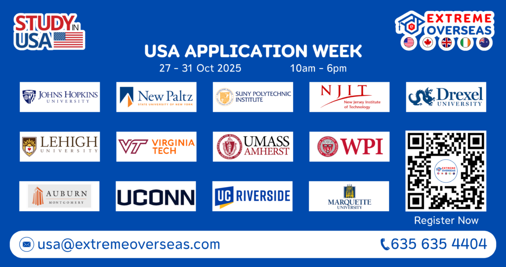 We cordially invite you to our USA Application Week, which includes Application Fee Waivers, Early Admission, Low Deposits for i20, Educational Loan Assistance, Accommodation, Scholarships, and Internships for students registering between Oct 27th and 31st. Our experienced counselors are prepared to offer tailored guidance on studying abroad in the USA. Seize the opportunity offered by USA Application Week for expedited admission.