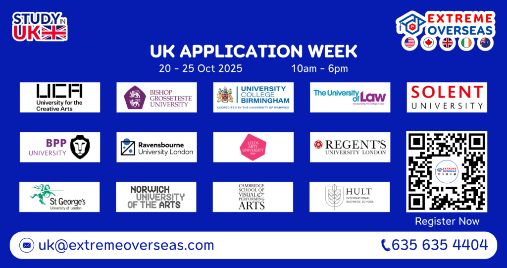 We extend a cordial invitation to join us for our UK Application Week on Oct 20th – 25th, 2025. This event features services such as early admission, reduced deposits for a Confirmation of Acceptance for Studies (CAS), educational loan assistance, accommodation arrangements, scholarships, and internships for students. Our experienced counselors will provide personalized guidance on pursuing education in the UK. Do not miss this opportunity for an expedited admission process.