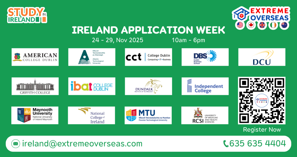 We are pleased to extend an invitation to you for our IRELAND Application Week, scheduled for the 24th to 29th November, 2025. This event will offer services including early admission, guidance on educational loans, accommodation planning, scholarships, and cooperative education programs for students. Our experienced counsellors are prepared to provide personalized guidance on studying in IRELAND. Kindly ensure you seize this opportunity to expedite your admission process.
