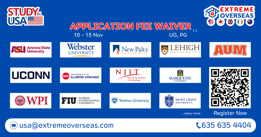 You are formally invited to attend our USA Application Fee Waiver Event. This event offers Application Fee Waivers, Early Admission, Low Deposits for i20, Educational Loan Assistance, Accommodation, Scholarships, and Internships to students who register between the 10th and 15th of Nov. Our experienced counsellors are available to provide personalized guidance on studying abroad in the USA. Take advantage of the opportunities presented by the USA Application Fee Waiver Event for expedited admission.